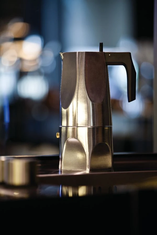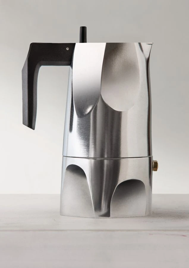 Fully aware of an object’s narrative ability, Sicilian architect Mario Trimarchi has designed Alessi’s “Ossidiana” espresso coffee maker. Like his other projects, this one is based on memories and fragments of images, told through the form of an article. “Ossidiana” embraces the memory of the various sides of the traditional moka coffee pot and those of obsidian, the volcanic stone it is named after.