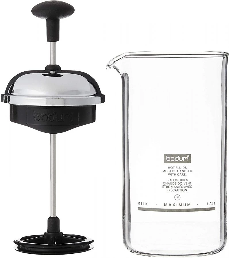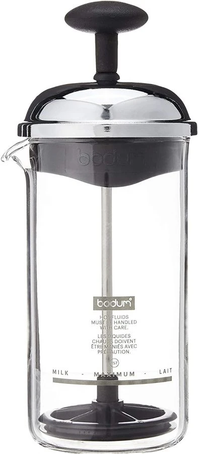 The Bodum Chambord manual milk frother that creates a smooth, consistent milk foam without the need for electricity or batteries.