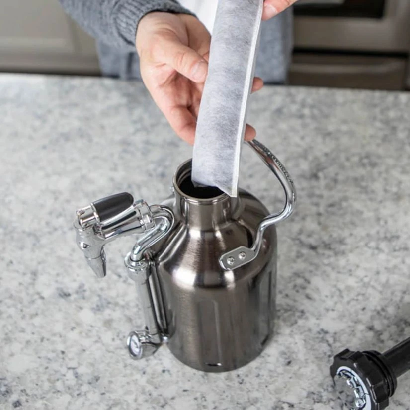 - Contents: uKeg Nitro, serving mat, coffee filter bags (4), 16 g nitro gas chargers (2), coffee funnel, manual and protective shipping bag.