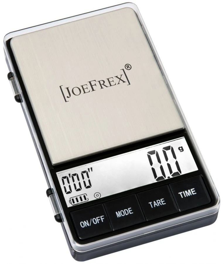 A small digital coffee scale with built-in timer for measuring your espresso shots and more. The barista scale has On/Off- and tare function, and a blue display light. Works with 2 x AAA batteries (included).