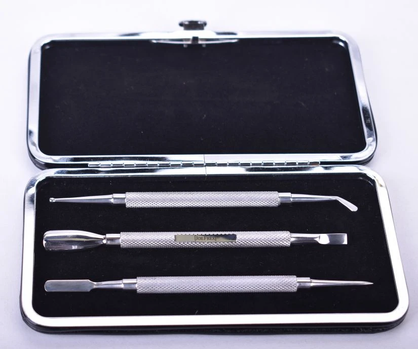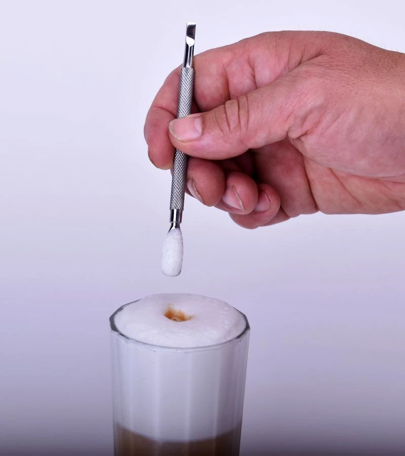 Latte art set with tree tools, and six different tips. For drawing patterns in milk based espresso drinks.