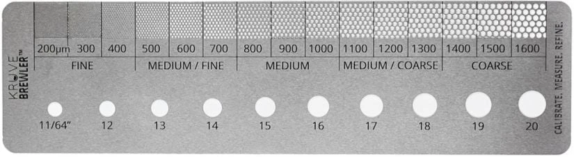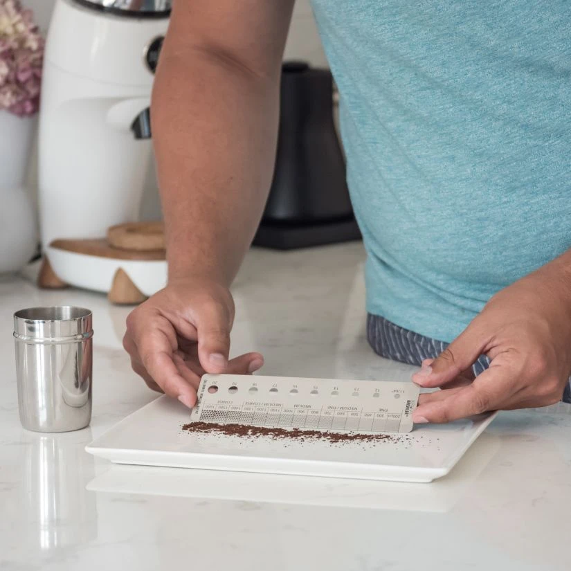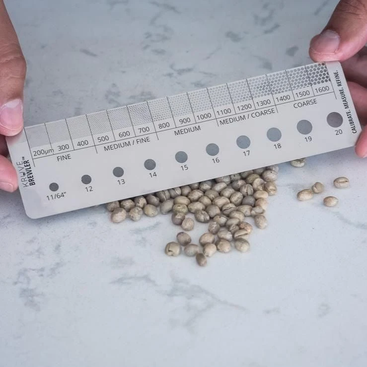 The Kruve Brewler is a handy stainless steel measuring tool that lets you quickly reference the size of green beans and coffee grind. The Brewler puts a measurable number next to Fine, Medium, and Coarse.