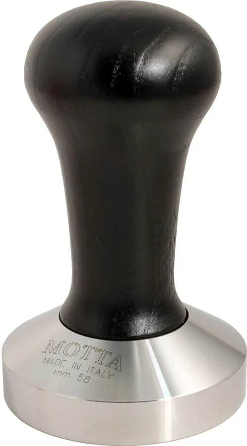 Nice and sturdy stainless steel tamper with a black wooden handle from the Italian manufacturer Motta. The stainless steel tamper part has a flat bottom.
