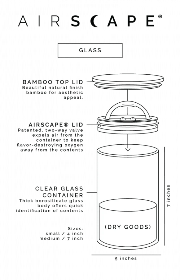 The original Planetary Design Airscape coffee & food storage canister with a patented plunger lid removes and locks out air and humidity creating airless food storage; extends the life of coffee, tea, flour, sugar, cereal, cookies, seeds, herbs, nuts, pet food or any perishable goods.