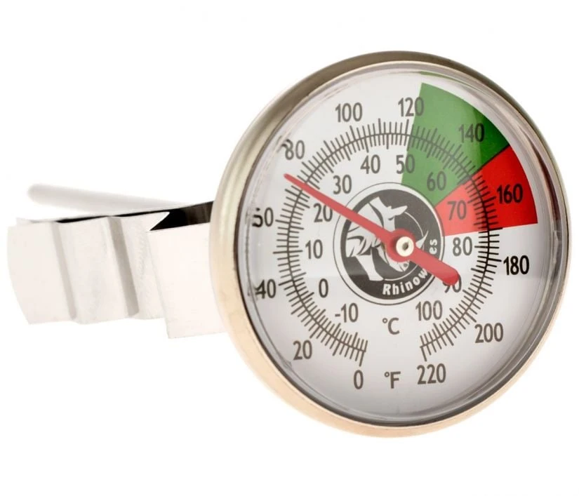 The easy-to-read dial on the Rhinowares milk thermometer allows for quick and accurate measure of textured milk and other beverages. The thermometer is 13 cm long. Temperature is shown within the range of -18 to 104 degrees Celsius, and it has a marked range for recommended milk temperature. The thermometer is also equipped with a stainless steel clip with adjustable height, allowing the thermometer to sit perfectly in a milk pitcher.