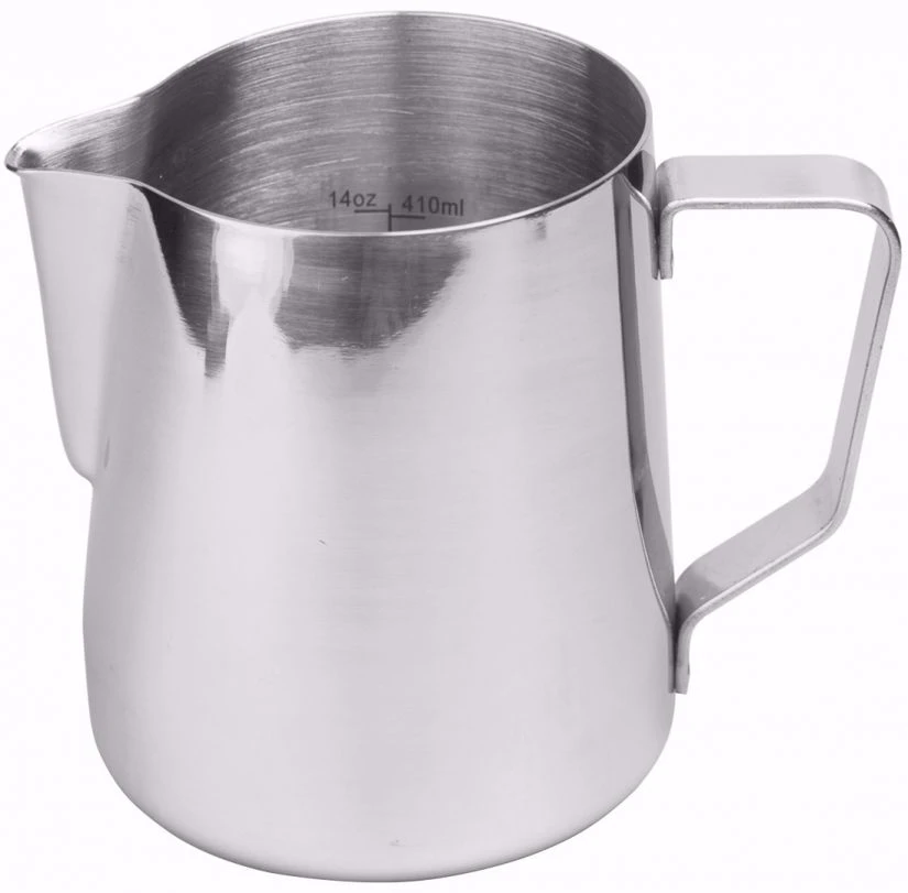 The Rwinowares Stainless Steel Pro Milk Pitcher has scale markings on the inside for easy measurement. The markings are on both sides, for both left handed and right handed reading. The pitcher is made of high quality stainlessa steel in 1 mm thickness. The comfortable handle with it’s elegant design, and practical pouring spout make the milk pitcher an ideal tool for every barista.