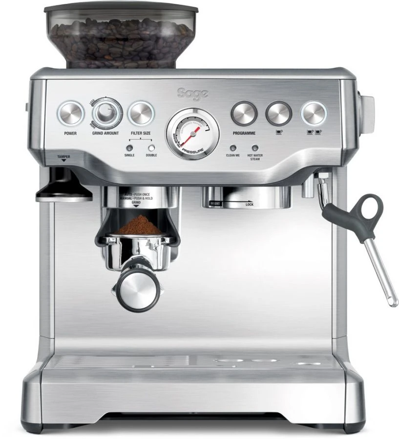 Sage the Barista Express espresso coffee maker allows you to grind the beans right before extraction, and its interchangeable filters and a choice of automatic or manual operation ensure authentic café style results in no time at all. The Barista Express heats up quickly thanks to its 1850W Thermocoil heating system. The water heats up while it passes through coiled stainless steel tubing in the heating unit.