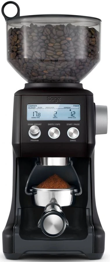 The Sage Smart Pro coffee grinder with 60 unique settings. This programmable conical burr grinder maximizes the potential of any brew. Choose between ‘cups’ for French Press or Filter and ‘shots’ for Espresso to get the right dose for the coffee you’re brewing. Grind directly into a portafilter or an air-tight container.