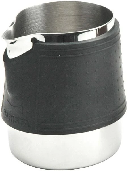 Milk pitcher with a collar of thick silicone that protects your hand from the heat. It also makes the grip more comfortable and increases control when creating latte art.