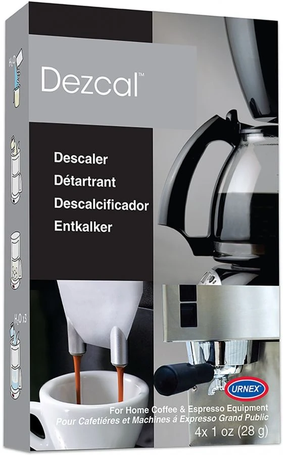 Urnex Dezcal Descaling Powder for removing lime scale from espresso, automatic, and pour over coffee machines.